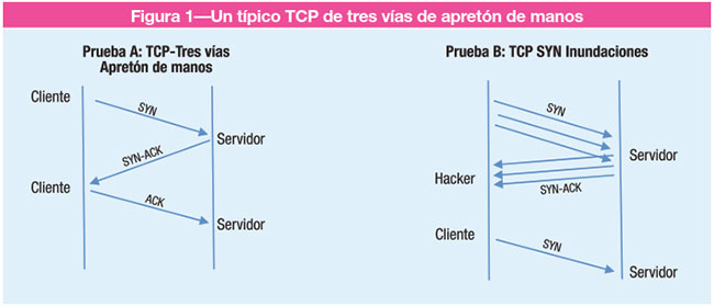 Entonces, ¿qué es un ataque DDoS? Uno de los tipos más comunes de ataque DDoS es la inundación TCP SYN,9 que explota una vulnerabilidad inherente en el Protocolo de Control de Transmisión (TCP),10 un conjunto de reglas para establecer y mantener una conversación confiable entre dos computadoras a través de Internet.