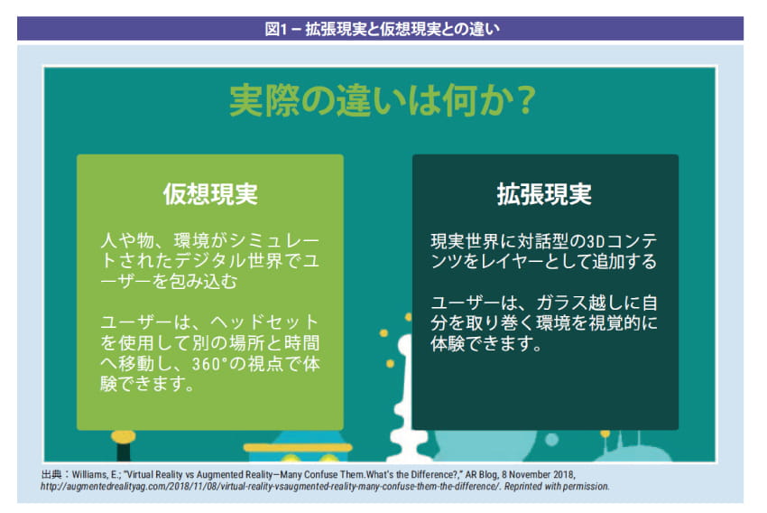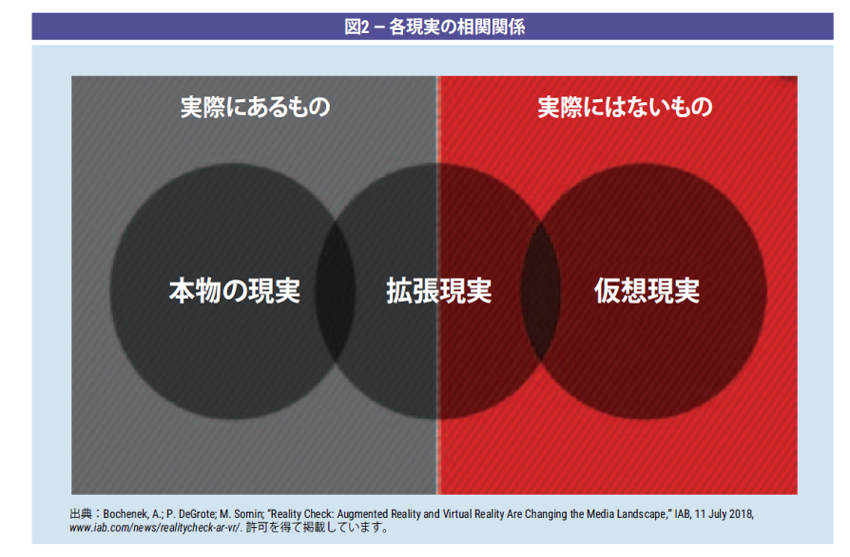 20年以上前、仮想現実(VR)とは、ビデオゲームコンソールと通信し、テレビではなくヘッドセットに内蔵された4インチの画面に映るビデオゲームをプレイすることを可能にする、シンプルなヘッドセットに過ぎませんでした。実際にイノベー ションや変化と言えたのは、画面を見る行為がテレビから数メートル離れるのではなく、目の前から数センチ離れることだけでした。現在のVRは、現実世界とはまるでかけ離れた完全な仮想環境です。通常、VRテクノロジーのユーザーは、仮想環境とのやりとりのために、ヘッドセットを装着します。拡張現実(AR)は、電子メガネ(ゴーグル)をかけることで、現実世界にグラフィックイメージを追加し、拡張体験を見せる仮想オーバーレイを提供します。ARの例としては、ポケモンGOが挙げられます。このモバイルゲームでは、プレイヤーのスマートフォンのGPS機能を使用して、実際の物理的位置を検索し、現実世界にグラフィックアイテムやモンスターを重ねて置きます。図1は、ARとVRの違いをまとめたものです。図2は、各現実の相関関係を示しています。
