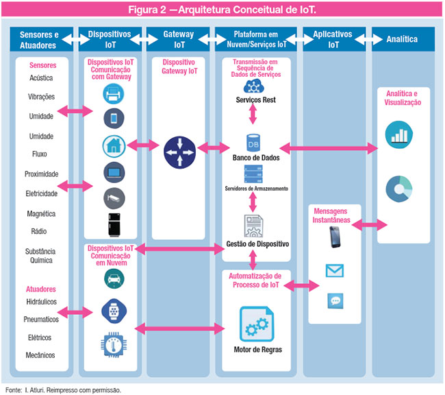 Figura 2 mostra uma arquitetura conceitual de IoT. Os dispositivos de IoT geralmente se enquadram em uma de duas categorias - um tipo de dispositivo interage com um gateway e o outro tem um gateway incorporado no dispositivo. A segunda categoria de dispositivos inclui principalmente dispositivos que precisam estar em movimento constante, por exemplo, carros inteligentes e vestuário para preparação física.
