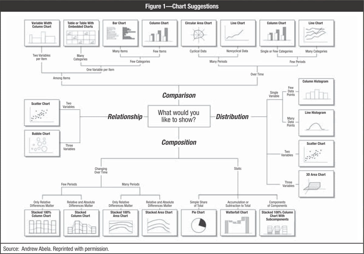 To help determine which graph to use, see figure 1, created by Andrew Abela, author of the book Advanced Presentations by Design.5