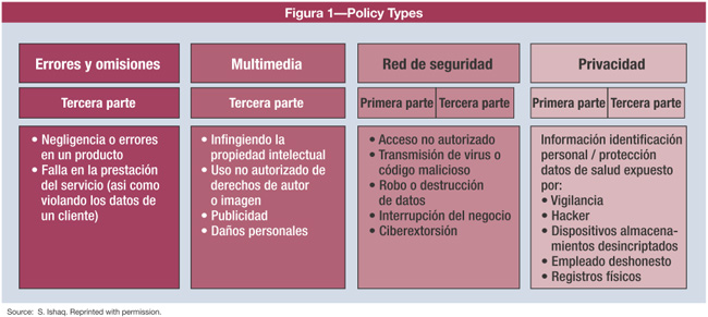 Una política tradicional de responsabilidad general sólo cubre daños a la propiedad, por lo que es insuficiente para abordar casos cibernéticos porque los datos son intangibles. Ante estas deficiencias, hay aproximadamente 50 aseguradoras globales que ofrecen ciber protección, 35 de las cuales son operadores de los Estados Unidos.6 Ofrecen alguna combinación de los cuatro siguientes componentes (figura 1):7