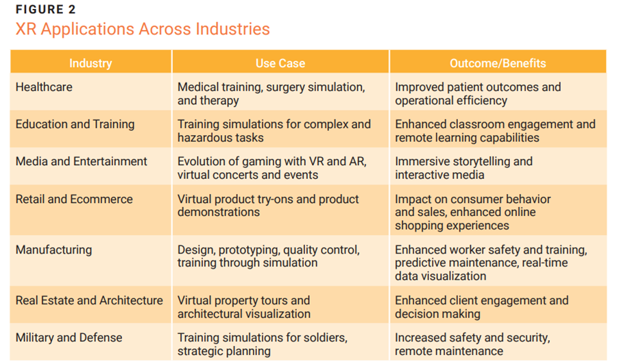 XR is revolutionizing multiple industries by enhancing user experiences, improving training and education, and streamlining complex processes. Some of the current and potential applications of XR in various industries are illustrated in figure 2.