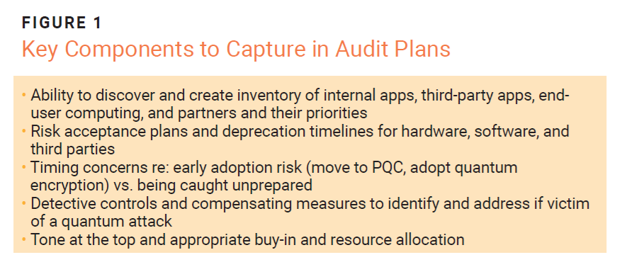 Obvious key target groups include engineering, IT, and security staff because they are the ones evaluating and implementing PQC solutions. Other major target groups are procurement and third-party risk professionals. These teams should understand organizational risk and must go beyond checking if the algorithm is on the approved list. They must think about actions and policies that need to be implemented today to minimize future HNDL exposures. In addition, audit, risk, and compliance functions must be well informed so that they can build new audit programs (figure 1) and ensure that enterprise risk registers reflect the various areas impacted by Y2Q. The organization must be prepared when customers, regulators, or board members ask: “What are we doing about quantum?”