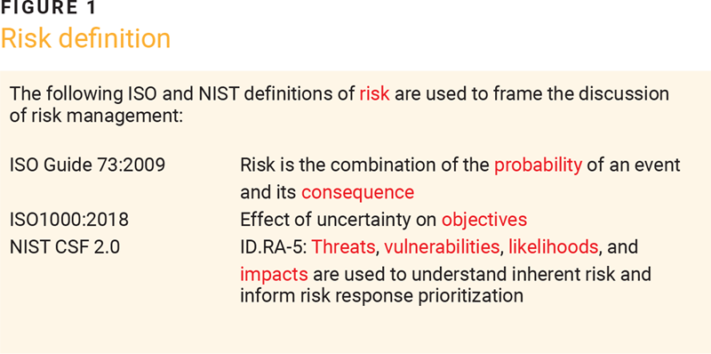 The following International Organization for Standardization (ISO) and US National Institute of Standards and Technology (NIST) definitions of risk are used to frame the discussion of risk management:
