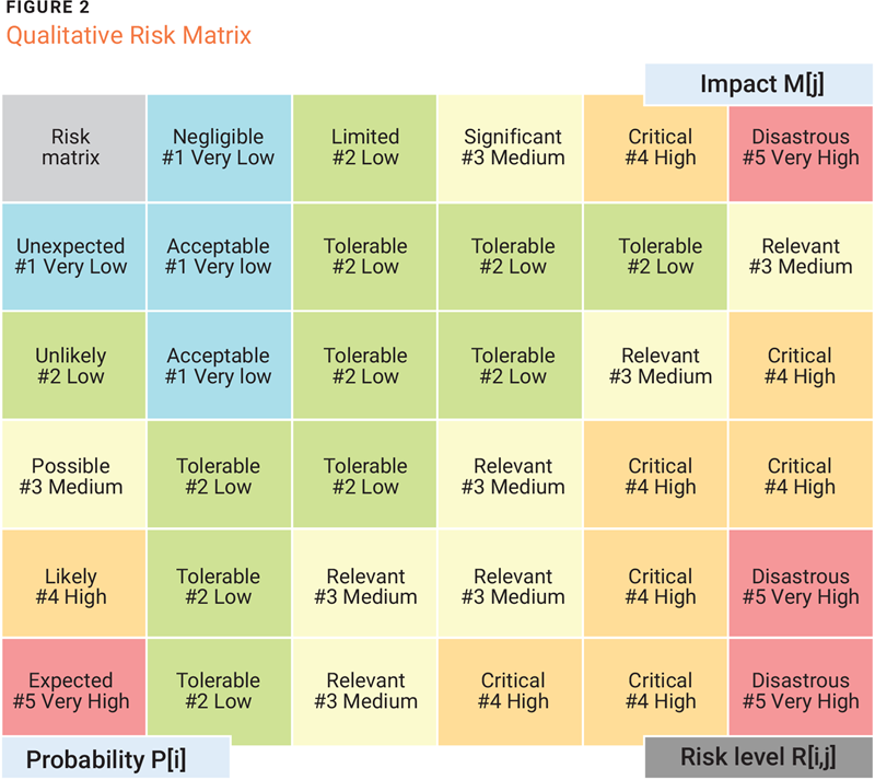Typically, the risk level is derived from a combination of a probability value of the event occurring and a measurement of the extent of the consequences (figure 1). This definition is easily represented with a matrix function that expresses the concept of risk as a relationship between the coordinates of the probability and impact values.