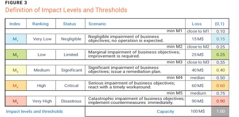 To interact with senior management, a table similar to figure 3 is used. The aim is to associate the ranking labels with a numerical value on which to develop the mathematical calculations. The figure can be used to determine an economic loss value for each level of impact. The lower threshold of the level must also be selected from three qualitative possibilities: adhering to the selected level, taking a median position, or adhering to the lower level. The enterprise’s maximum loss capacity must also be defined, which is normalized to 1. All economic loss values are normalized in proportion to the maximum value identified.
