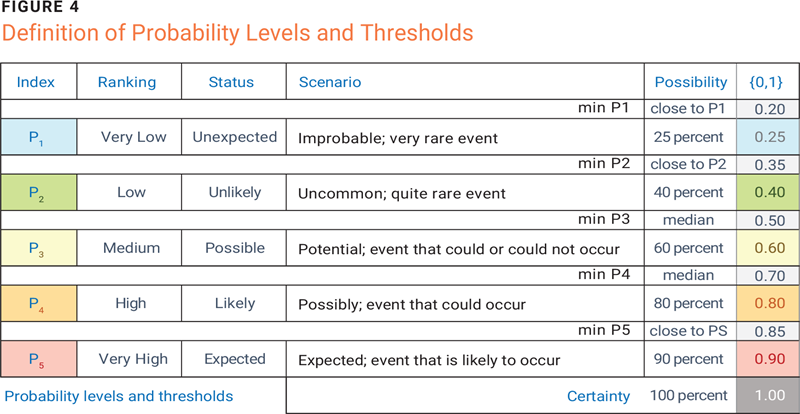 Constructing the metrics to manage the likelihood of a risk event also requires a determination of the probability thresholds, similar to the method for determining the impact. Senior management’s sensitivity to probability thresholds is not as cohesive as the concept of economic loss, but a similar scheme can be used to make these assessments (figure 4).
