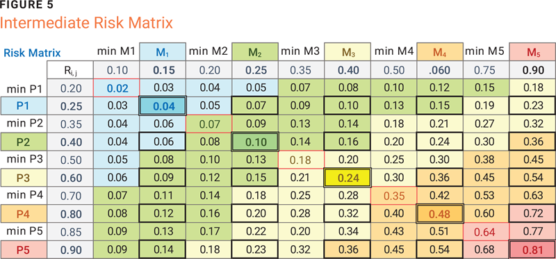 The sequences of levels and thresholds established by senior management are distributed in preestablished positions in rows and columns of the intermediate matrix. Probability, impact, and the related thresholds are all approximated to the upper 0.05 value, while the corresponding risk levels obtained in the crossing cells—the numerical product of probability and impact—are expressed with an upper approximation of 0.01. The threshold values are distributed in the intermediate positions between two impact or probability levels and represented in the intermediate matrix in figure 5.