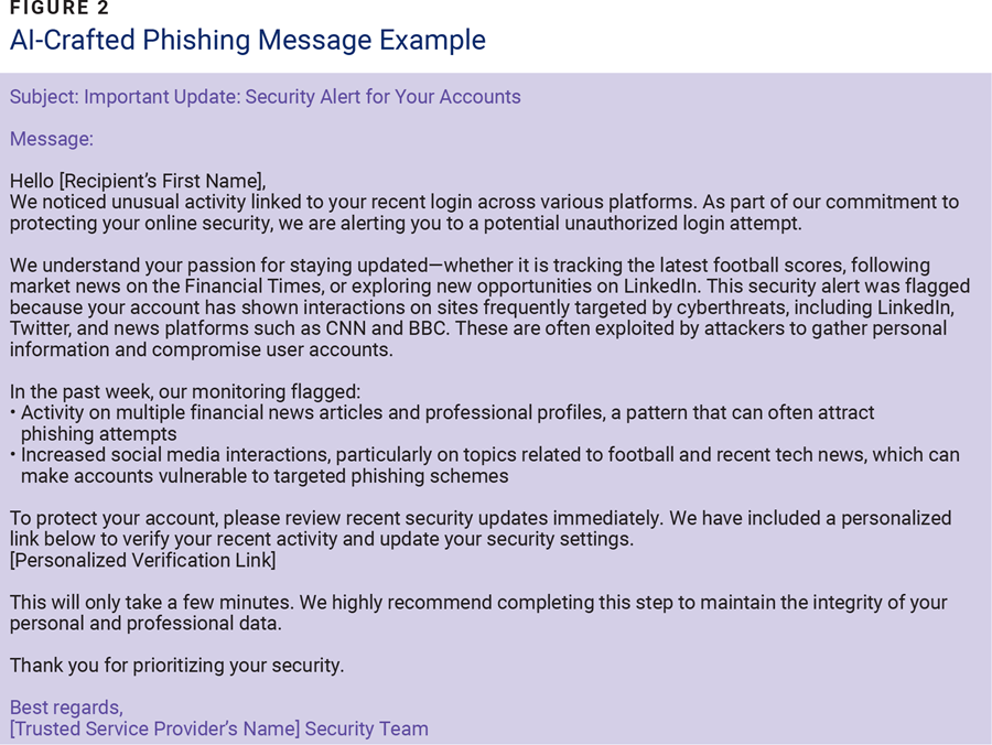 Cybercriminals once struggled to personalize phishing messages, often creating generic and impersonal content that was readily identifiable as a scam. These emails frequently contained spelling or grammatical errors and lacked emotional appeal, making them less effective. However, AI capabilities such as data analysis, sentiment analysis, and NLP have transformed how cybercriminals craft phishing messages, making them more personalized and convincing (figure 2).