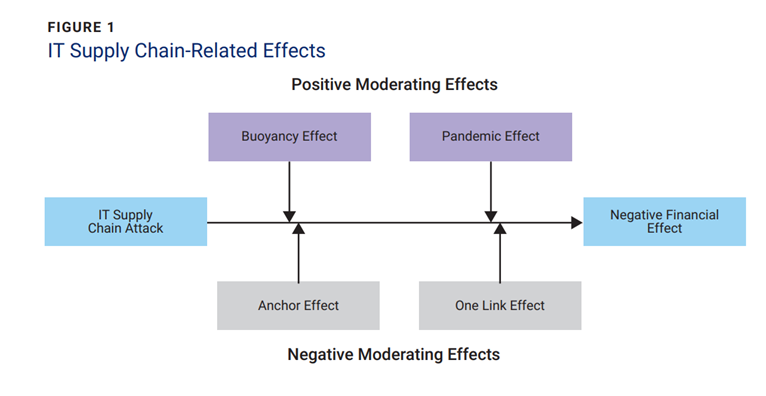 Based on these results, it is likely that supply chain cyberattacks are more complex than a weak link in the chain. Analysis of these results shows four effects associated with IT supply chain attacks (figure 1). These effects are connected to the concept of the weakest link but go much further in explaining the effects on the IT supply chain. These four effects are the: