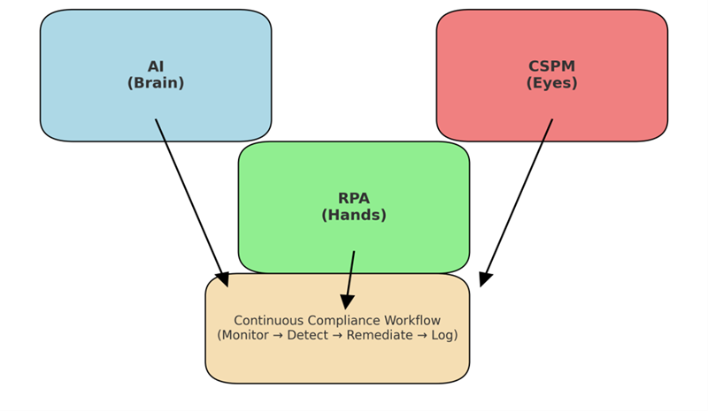 It is essential to have AI, RPA, and CSPM come together rather carefully. In a single compliance workflow (Figure 2), AI may act as the analytical brain that interprets the live signals and analyzes the anomalies. RPA is the hands that automate the routine evidence collection and documentation. CSPM serves as the eyes and scans the environment to find misalignments.