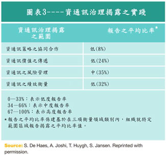 通常來說若所觀察者為平均偏低之資通訊治理報告率,廠商之報告內容大多數將會集中於資通訊風險之管理及資通訊之績效衡量(圖表3所示),令人吃驚地是,就所觀察之樣本來說,期間之各個組織中,資通訊之全盤策略規劃是最少被揭露的類別項目之一,這項結果顯示出在每年之年報中。就整體之公司治理在透明度方面尚有改進之空間,學術性之研究文獻明確指出,資訊揭 露從非財務之觀點而言具潛在之利益,公司資通訊治理就特殊之相關論點,會提供廠商一項明確之誘因去考量增加其資通訊治理之公開揭露程度。