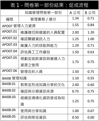 表一為兩間公司在促成流程部份的計算結果(問卷第一部份)。研究結果顯示,A公司部份實施了這兩項流程( 總分為1.34 ), 其流程 APO07和流程BAI08的調查結果則分別為1.55和 1.10。B公司則實施了某些知識管理流程(總分為0.71),而這也與其調查結果相符,分別皆僅 為A公司的一半。