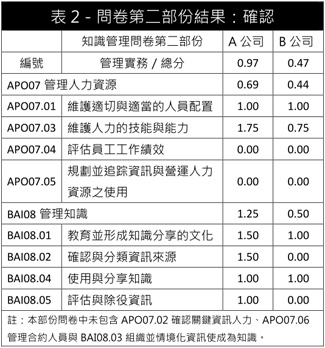 表二為問卷第二部份-確認-的計算結果,確認部份的問項與第一部份-促成流程-不同,但受訪對象是同樣的。研究結果顯示,A公司部份實施了這兩項流程(總分為0.97),與個別流程調查結果相符:流程APO07(0.69)和流程 BAI08(1.25)。B公司則呈現了較低的結果(總分為0.47),而這也與其個別流程調查結果相符:流程APO07(0.50)和流程BAI08(0.44)。
