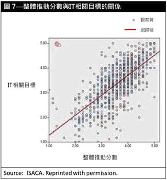 由圖 1 顯示,COBIT 5 已經介紹7 項GEIT 推動及IT 相關目標與企業目標逐漸實現的層級關係。具體而言,7 項GEIT 推動的成功導入與管理是正向關聯IT 相關目標實現,IT 相關目標實現更進一步實現企業組織目標,彼此有層次關係。根據894 問卷填答者的問卷衡量顯示,7 項 GEIT 推動有逐漸實現IT 相關目標與企業組織目標(有5 個衡量尺度,1 沒有實現至5 完全實現),本研究發現,7 項推動導入/管理的整體平體均分數與IT 相關目標實現的整體報導平均分數,兩者有顯著正相關(如圖7)。此條正斜率的迴歸線顯示,7 項推動導入/管理與IT 相關目標實現, 兩者有顯著正相關。此研究發現, 與 COBIT 5 目標實現層級圖1 一致。此顯著正相關,也可以確認37 題流程推動分數。 圖8 表達顯示,整平均流程分數與IT 相關目標實現,兩者有顯著正相關。最後研究確認,IT 相關目標實現與企業組織目標實現,兩者有顯著正相關。 IT 相關目標實現結果正向連結企業目標實現(如圖9)。